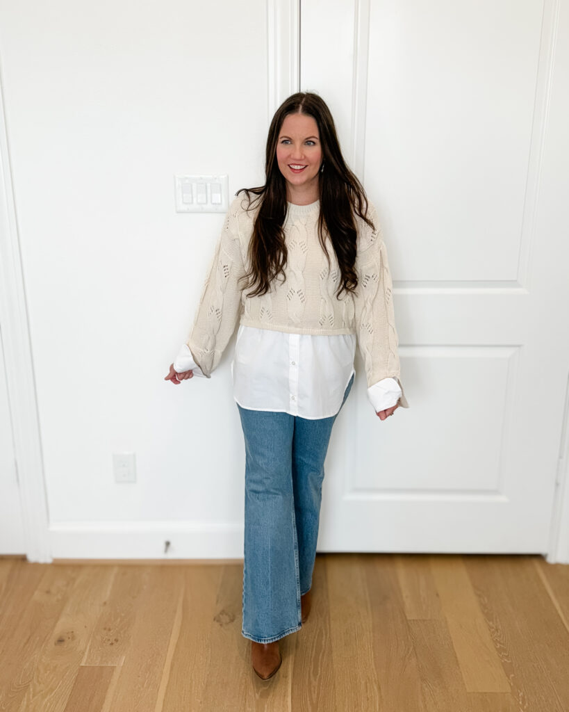 I’m a big fan of the twofer style top. This Pilcro cable twofer sweater is a ivory cable knit sweater on top with a white button down top attached to the bottom. I think the twofer styles can be more …